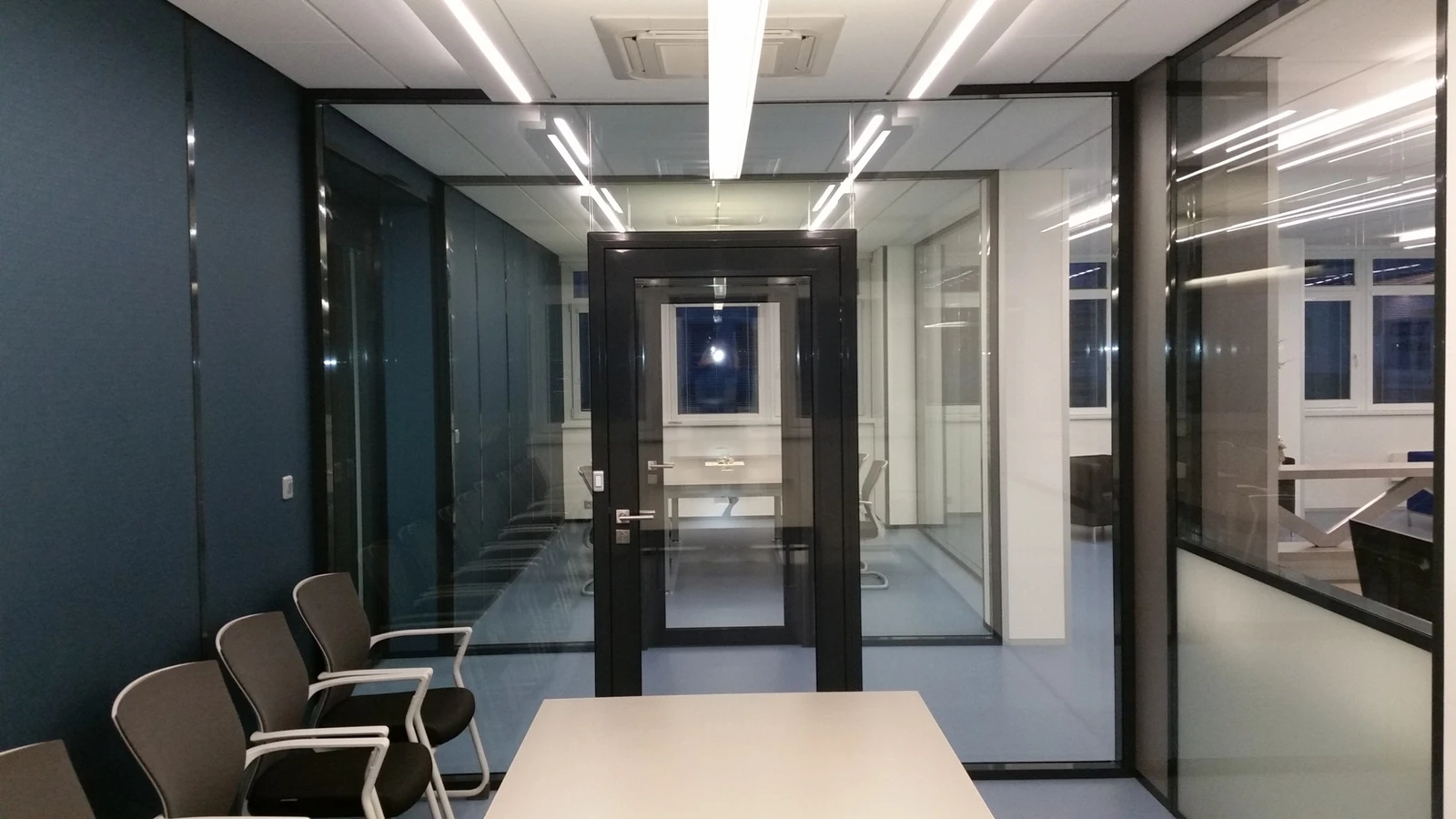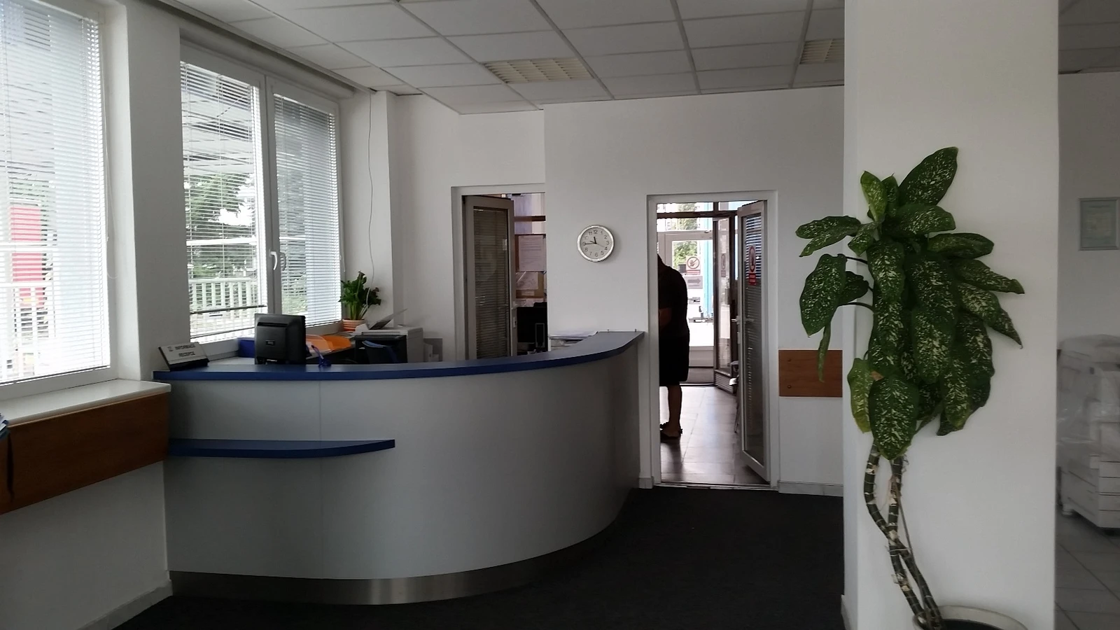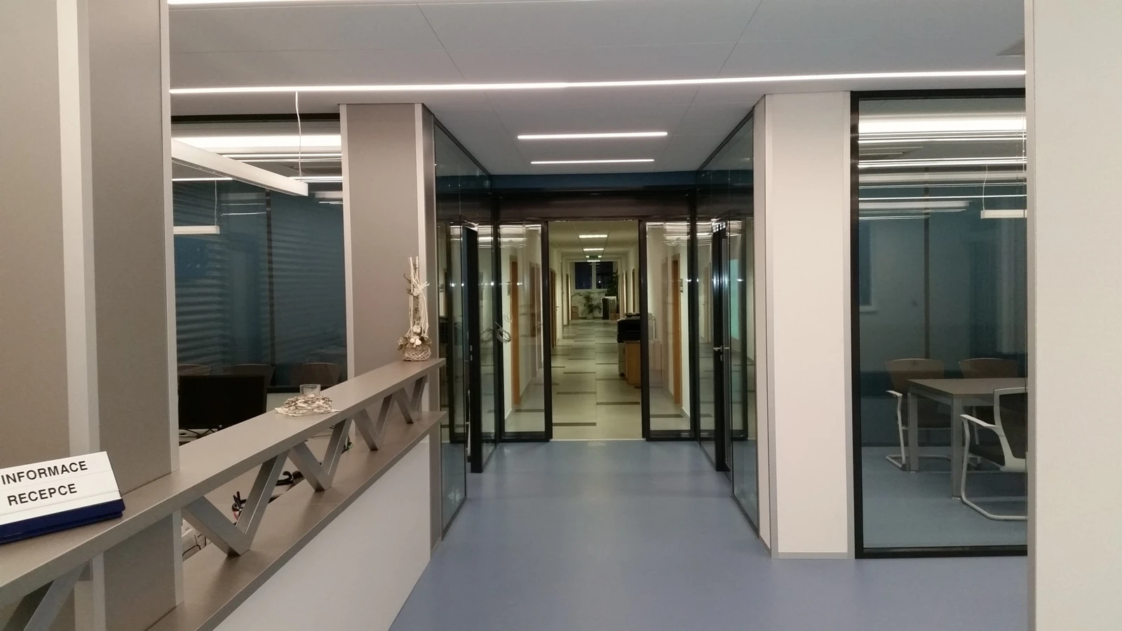 Projektované stavební úpravy zvětšují vstupní halu a opticky propojují vstupní prostor s jednacími místnostmi za skleněnými příčkami. Jádrem provozu je recepce, která je otevřená s možností částečného oddělení dveřmi.